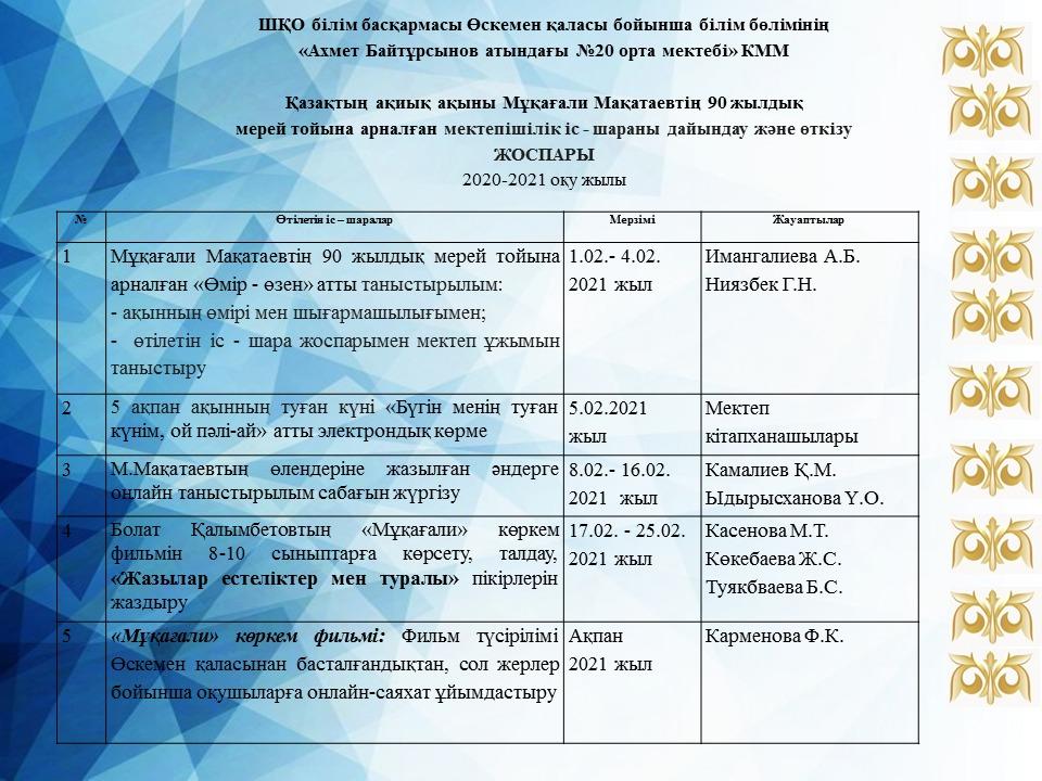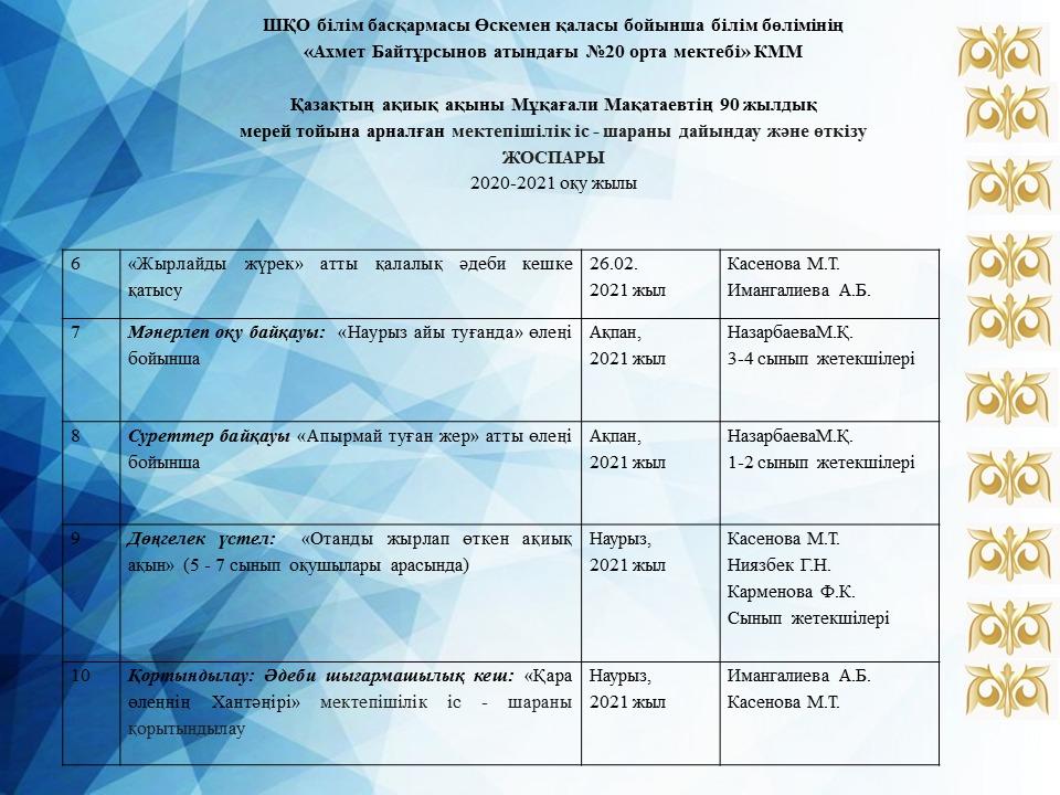 Ғасырдың саңлағы, қазақтың мұзбалақ ақыны Мұқағали Мақатаевтың дүниеге келгеніне 90 жыл толып отыр. Осыған орай біздің мектебімізде де әртүрлі іс-шаралар жүзеге асырылуда. Басты мақсат - оқушылардың әдебиетке деген қызығушылықтарын ояту, сонымен қатар, ұлы ақынның шығармашылығымен таныстыру болып табылады. Мұқағали Мақатаевтың мерейтойына арналған іс - шараларға белсене қатысуға шақырамыз.